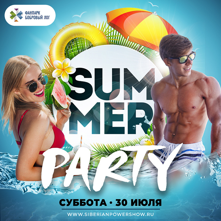 30 июля в 14:00 Фанпарк «Бобровый лог» вместе с Siberian Power Show приглашают в пляжный комплекс «МИРАЖ» на яркую Summer Party! На сцене бассейна пройдет конкурс красоты Фитнес-Бикини!