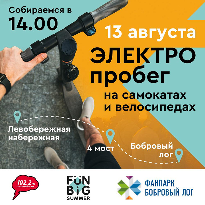 Устроим электропробег самокатов и велосипедов по маршруту Левобережная набережная – Николаевский мост (он же 4-й мост) – Фанпарк «Бобровый лог». Старт в 14:00.