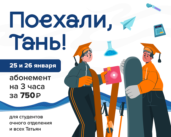 Услуга «Абонемент «Поехали, Тань» предоставляется только в кассе студентам очного отделения (действующий студенческий билет), девушкам с именем Татьяна (документ, подтверждающий личность (паспорт, права)). Включает в себя: предоставление объектов горнолыжного комплекса, а именно подъемы на канатно-кресельных дорогах К1, К2, сноупарка и спуск по подготовленной горнолыжной трассе в горнолыжном снаряжении с отсечкой 5 минут между первой и последующей активацией при прохождении через турникеты К1, К2 и сноупарка с 9:00 до завершения работы комплекса согласно регламента работы объектов в выходные дни, действует 3 часа с момента активации 25-26 января 2025г.