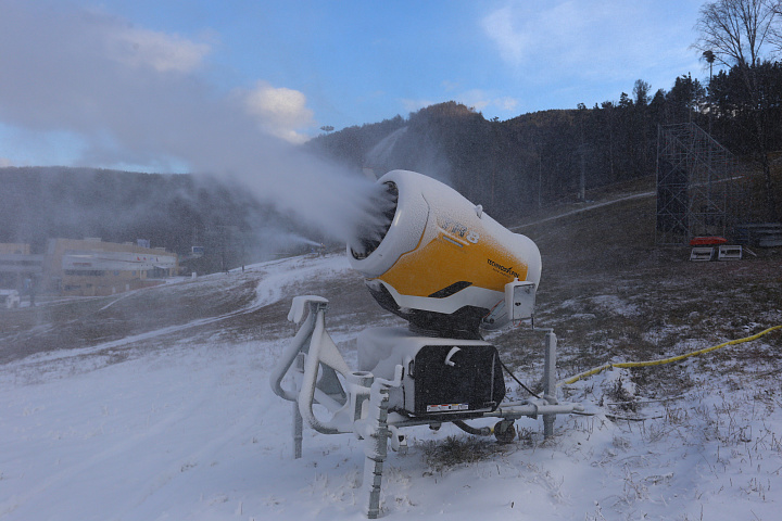 В Красноярске установилась минусовая температура, столбик термометра ночью опустился до отметки -8 градусов по Цельсию. В настоящий момент на трассах канатно-кресельного подъемника К2 искусственный снег генерируют 10 снежных пушек, на К1 – 23 снежных ружья.